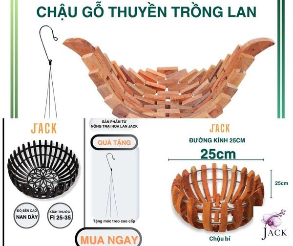 Chậu gỗ là lựa chọn được nhiều người chơi lan ưa thích vì gỗ tự nhiên giúp điều tiết ẩm độ tốt — hút ẩm khi giá thể thừa nước, nhả ẩm khi giá thể quá khô. Tại Cửa Hàng Jack, có một số dòng chậu gỗ được thiết kế riêng cho lan:
